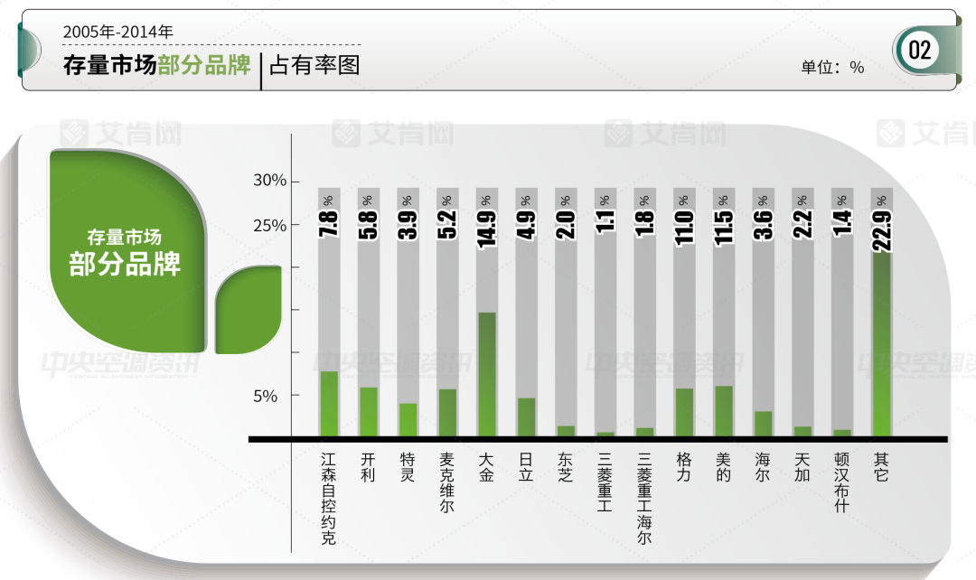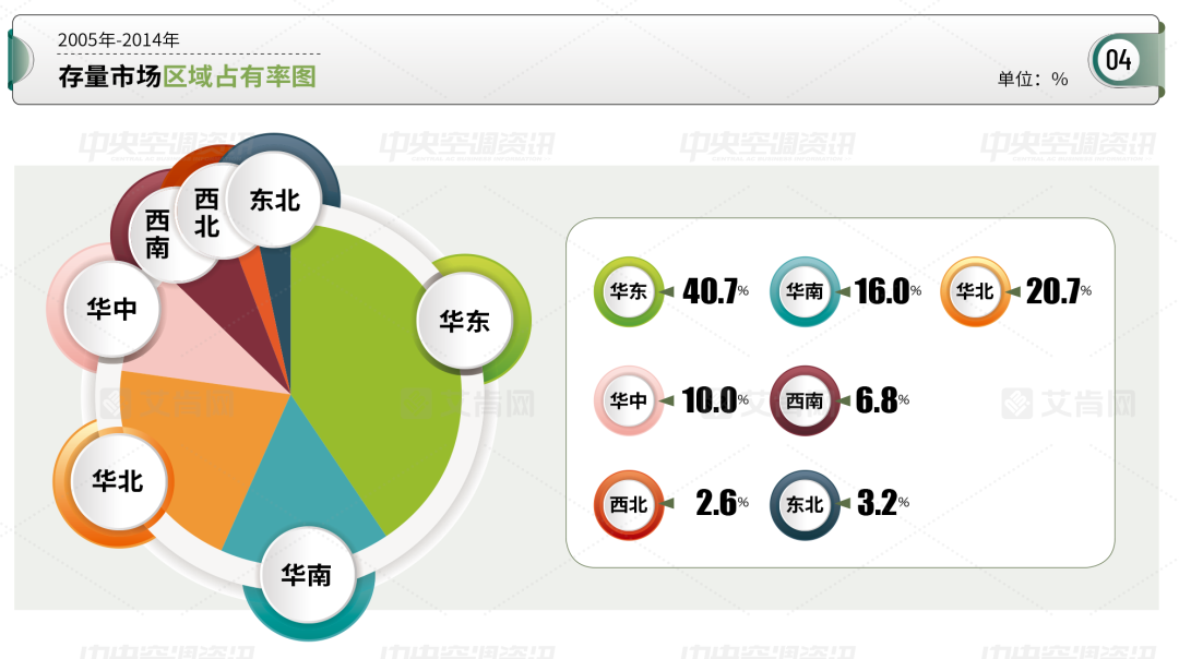 在区域占比方面,华东市场依旧是存量市场的第一大区域,占有率达到40.7%。艾肯网认为,华东不仅仅是中央空调市场的核心区域同时也是存量市场的关键所在,各大品牌都应该重点关注华东市场。华北和华南分别以20.7%和16%排名前二和前三。