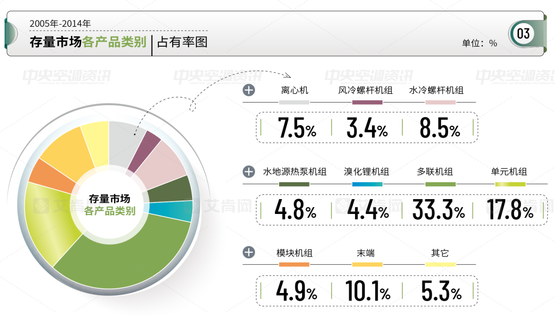 在产品格局方面,多联机组、单元机组、末端分别位居前三。根据艾肯网的统计数据显示,从2005年到2014年期间,市场份额最大的产品类型是多联机组,占有率达到33.3%。多联机排名首位也得益于房地产的快速发展,精装配套、大型公建项目的快速上马为多联机提供了广阔的市场空间。特别是家装零售市场的不断火爆,也让家用中央空调更为普及,家装零售市场也从华东沿海向内陆扩张,整体市场不断加速。