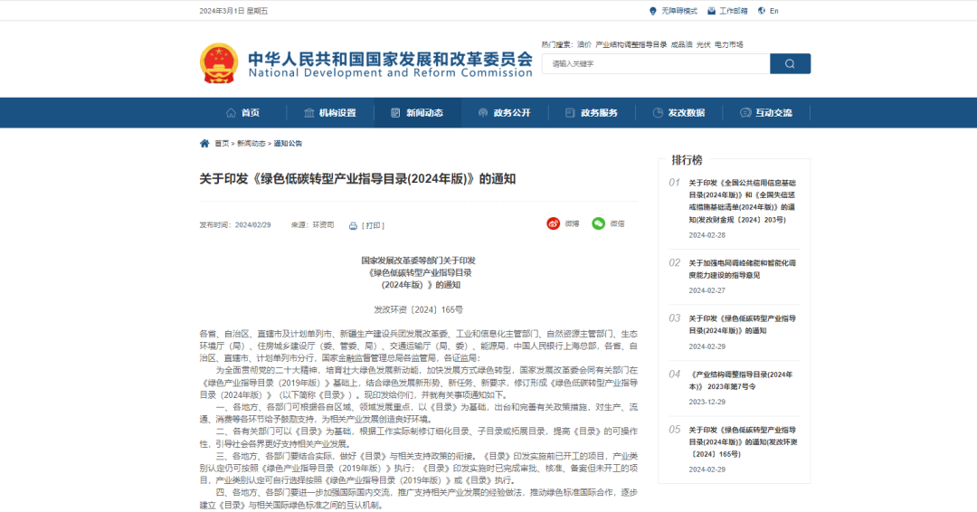 《绿色低碳转型产业指导目录(2024 年版)》的解释说明中提到: