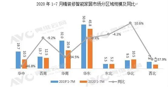 据奥维云网(avc)地产大数据监测显示:2020年1-7月全国精装修新开盘项目1,592个,同比下降23.1%,市场规模134.2万套,同比下降27.1%;其中智能家居配套率达82.2%,较去年同期上升了7个百分点。