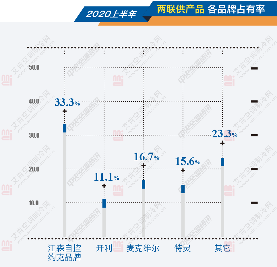 两联供产品是近几年中国中央空调市场中最受关注的产品之一,根据艾肯空调制冷网统计,2020上半年中国两联供产品的整体市场容量接近10亿元,在整体市场中的占有率约为2.1%,同比2019年末增长12.5%。两联供产品也是2020上半年中唯一增长的产品品类,需要说明的是,本报告统计的两联供数据并不包含运用于北方地区煤改电或者煤改清洁能源的两联供或者热风机产品数据。
