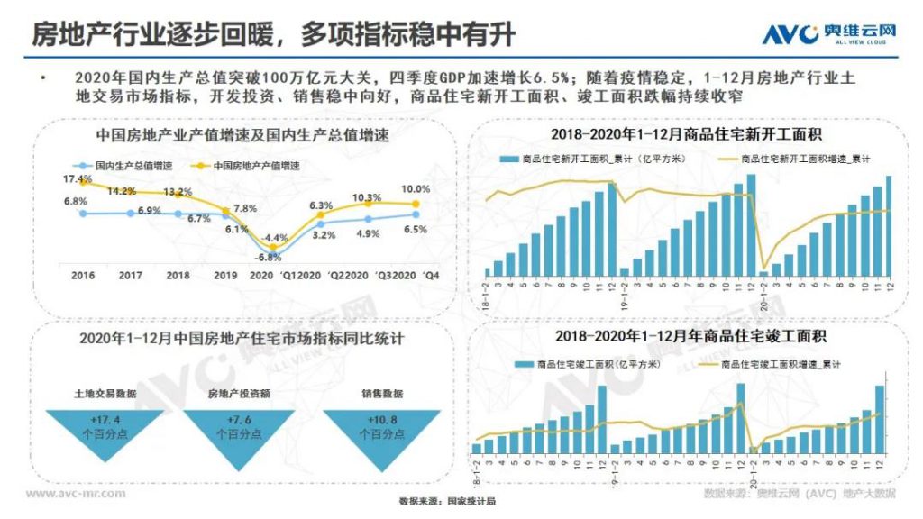 2020年中国经济依然坚韧,国内生产总值首次突破100万亿元大关。房地产作为中国经济的稳定器和压舱石,超预期发展对2020年经济做出了重要贡献,2020年1-12月房地产行业土地交易、开发投资、销售额等多项指标稳中向好,商品住宅新开工面积、竣工面积跌幅持续收窄。