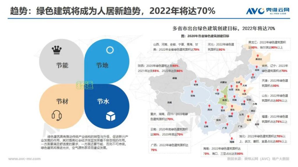 随着环保意识的加强,以及政府对环保治理力度的加大,绿色建筑成为人居新趋势。2020年多省市出台建筑创建目标,将在2022年实现城镇新建建筑中绿色建筑面积占比达到70%或以上。绿色建筑的推广和发展势必给精装修市场带来新的机遇和挑战。