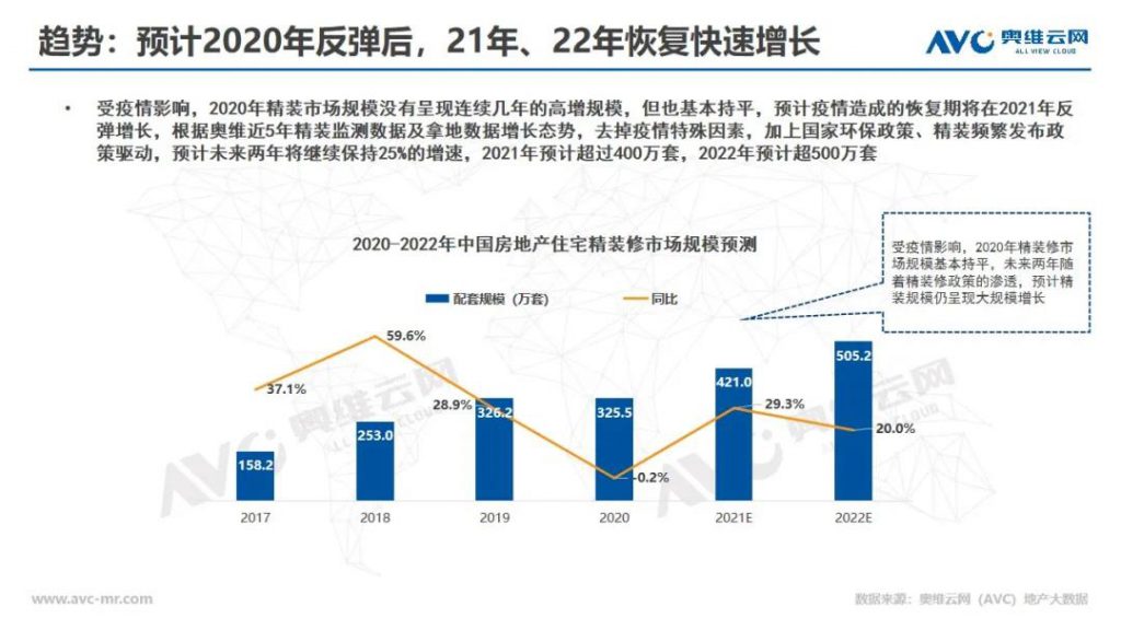2020年国家大力推行绿色建筑,将在南京、杭州、佛山、绍兴、湖州、青岛等6个城市开展支持绿色建材促进建筑品质提升试点工作,推广绿色建筑和绿色建材应用。2020年中央“房住不炒”,地方“因城施策”政策频发的环境下,精装修政策发布量也创历史新高,目前从国家级政策到区域级的政策、细则累计发布量已超140次,如今已经在全国大部分省市地区广泛推行。并且在绿色建筑政策加持下,精装修市场将进一步扩围,装配式、智能化等新型建筑工业化建造方式成为新趋势,加快推进精装修市场的落地。